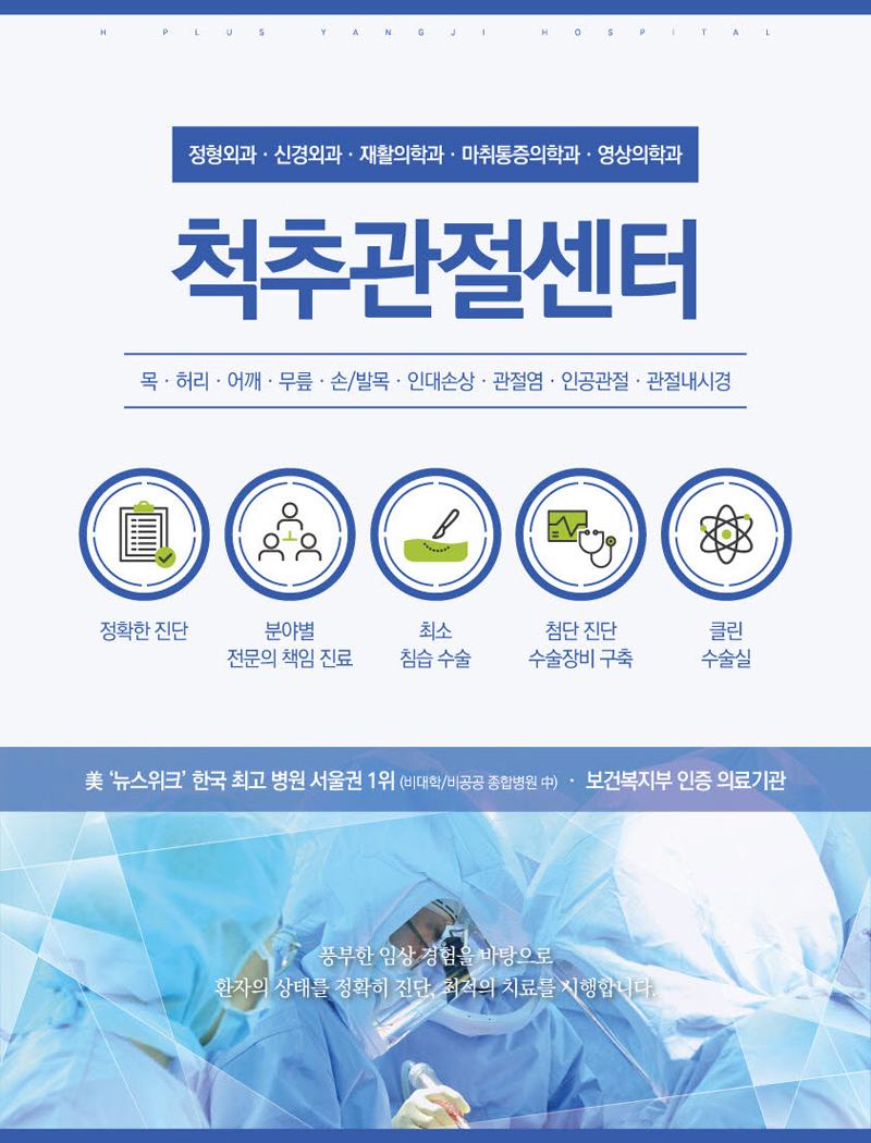 척추관절센터는 최소침습 수술, 최소절개 인공관절 수술, 관절 내시경, 체외충격파 치료법(ESWT) 등을 시행하며 첨단 의료장비로 정확한 진단과 치료방법을 제시하여 최적의 수술로 최대의 효과에 이르는 빠르고 고통없는 치료에 최선의 노력을 기울이고 있습니다.